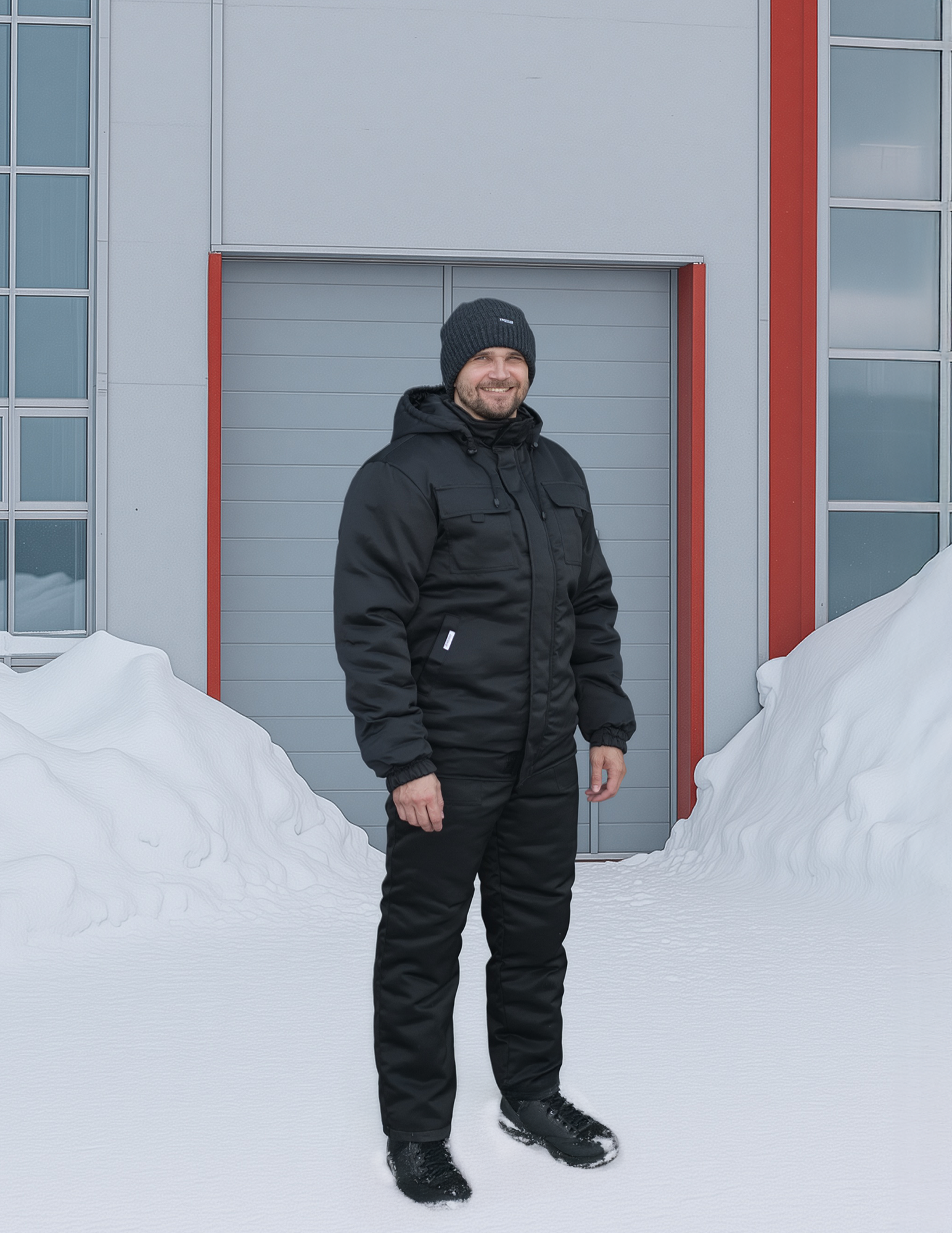 Утепленная модель из прочной смесовой ткани. Удобная модель на подтяжках, имеет дополнительную влагостойкую защиту.